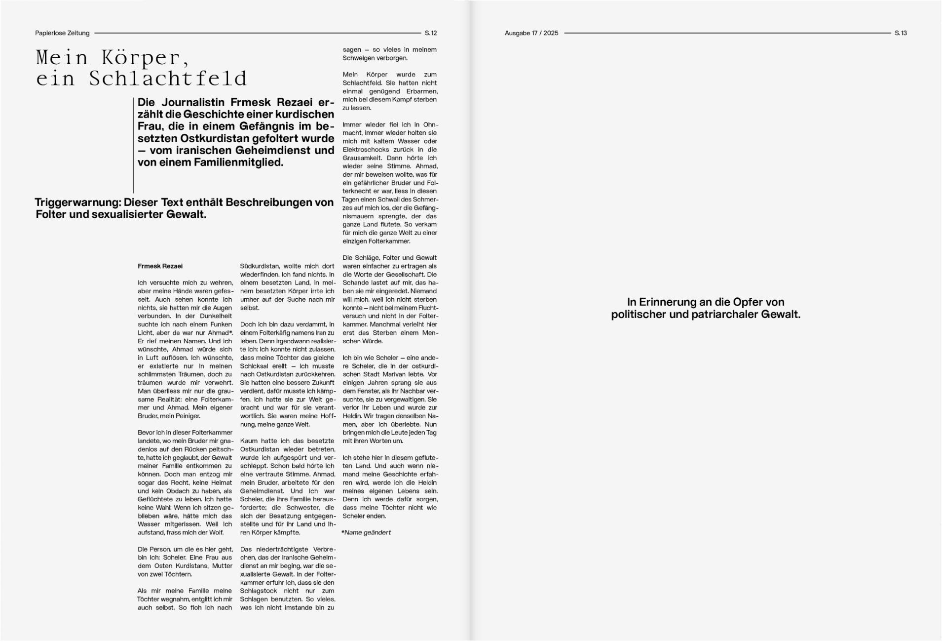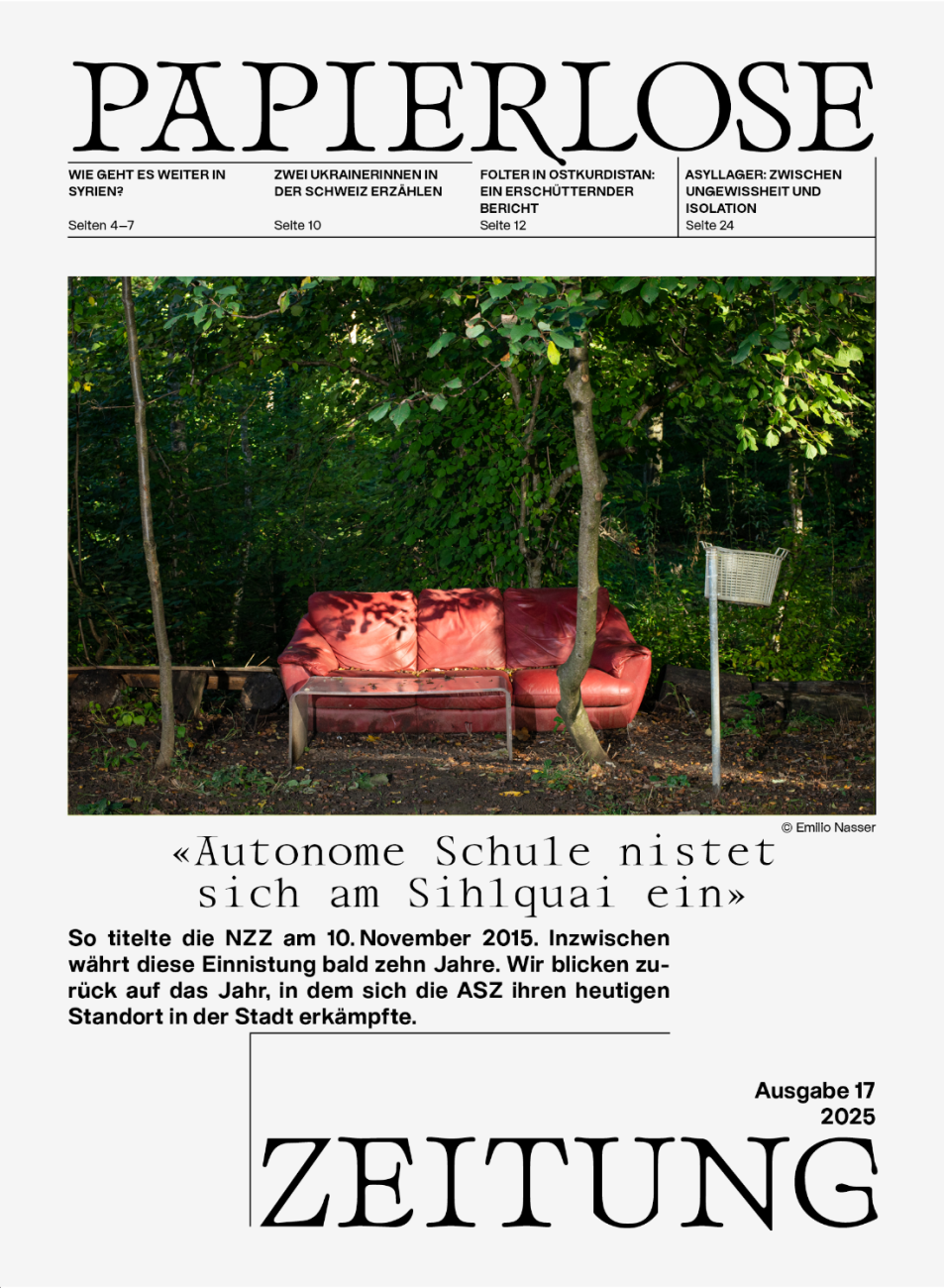 Redesign of the printed version of “Papierlose Zeitung”, a project of the Autonomous School of Zurich (ASZ), which brings together people with and without residence permit. The newspaper is published online with regular updates and in print once a year as a supplement to the weekly newspaper WOZ.